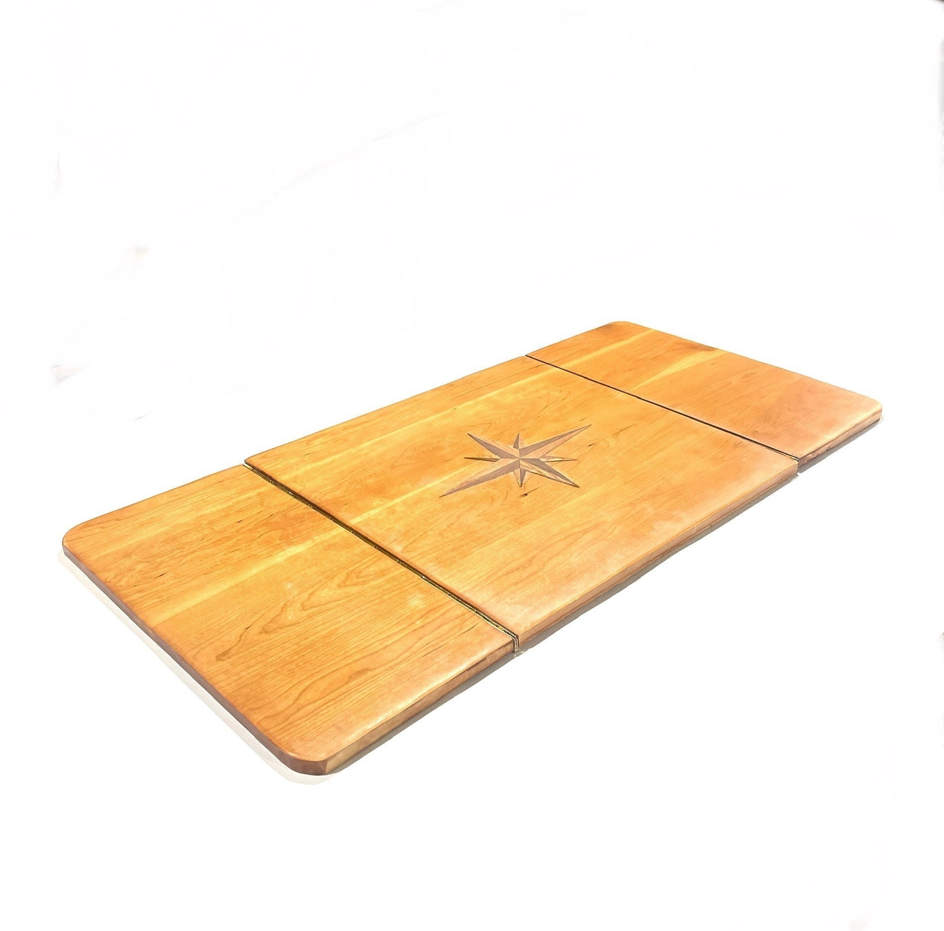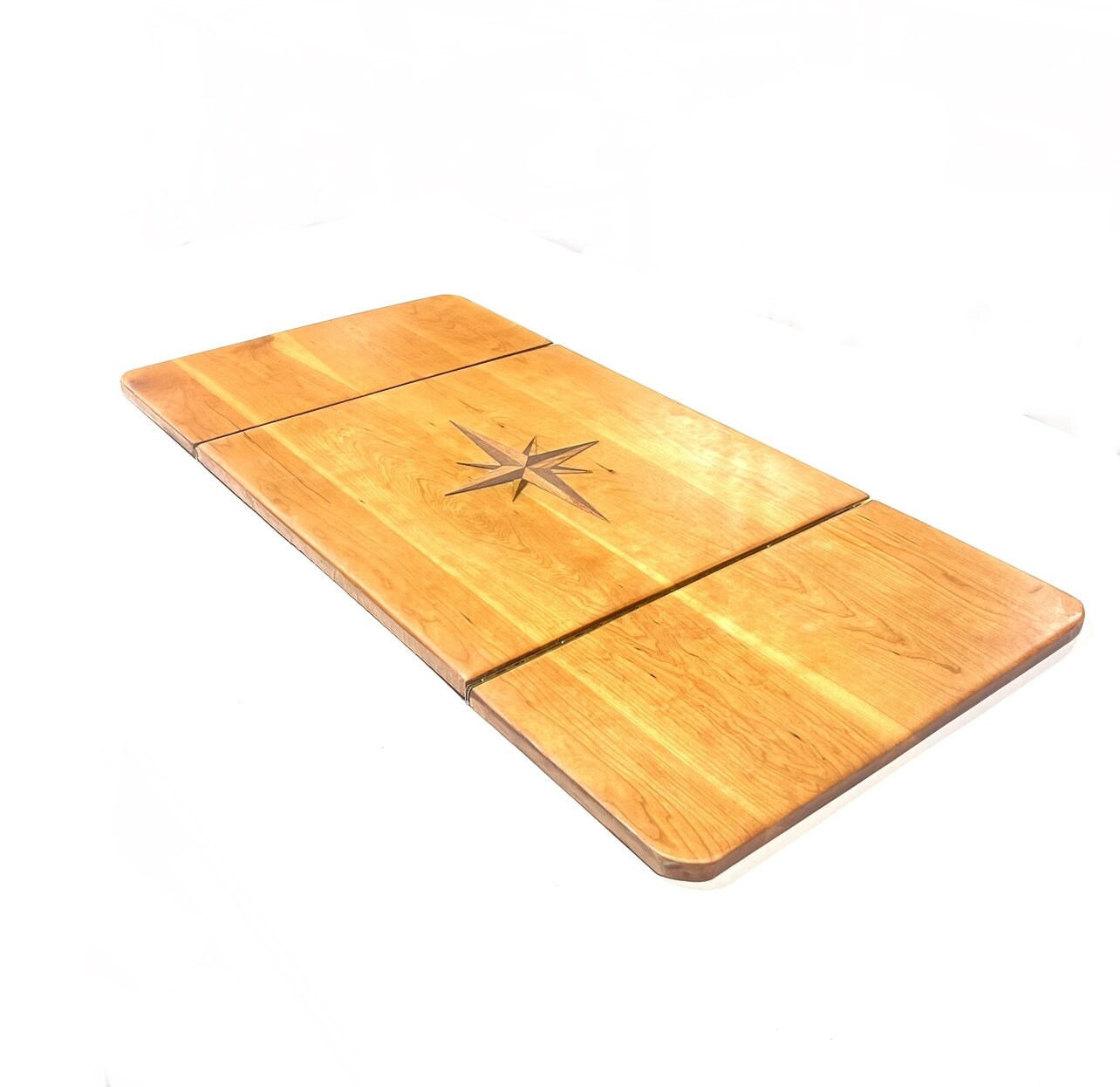 This handcrafted Folding Cherry boat table is exactly what you need to set your boat apart! It is durable and finished with an epoxy clear coat. It is ready to go outside or in and will hold up to any weather. This table is a made to order item and is customizable. This table features hinged sides, a Black Walnut and Ash compass rose inlay, and is made from Cherry. For pricing of an other woods please reach out.