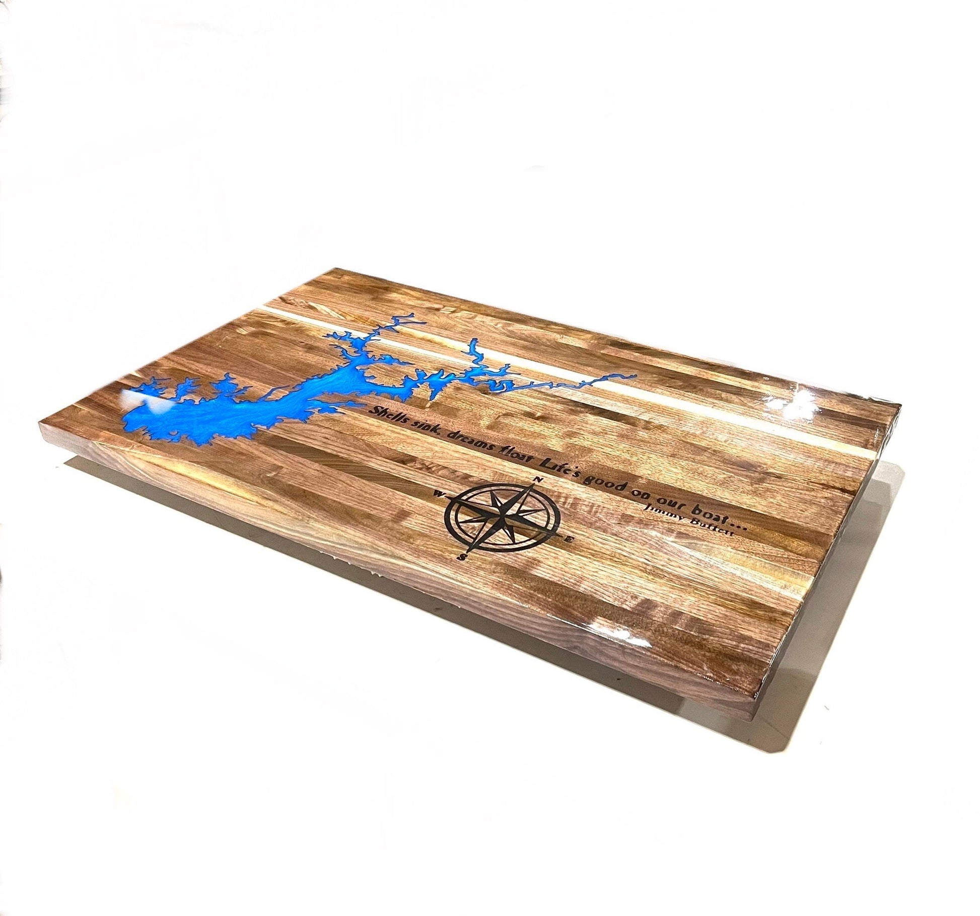 This handcrafted Solid Black Walnut boat table is exactly what you need to set your boat apart! It is durable and finished with an epoxy clear coat. It is ready to go outside or in and will hold up to any weather. This table is a made to order item and is customizable. You will be the envy of the lake with your own lake resin engraved on your table. This table also includes custom engraving including whatever you like, from a compass rose to your boat name, the lake name and more! We can also match your exact boat name image and engrave. We can also do a table with just the lake of your choosing and no font for a simple look.
